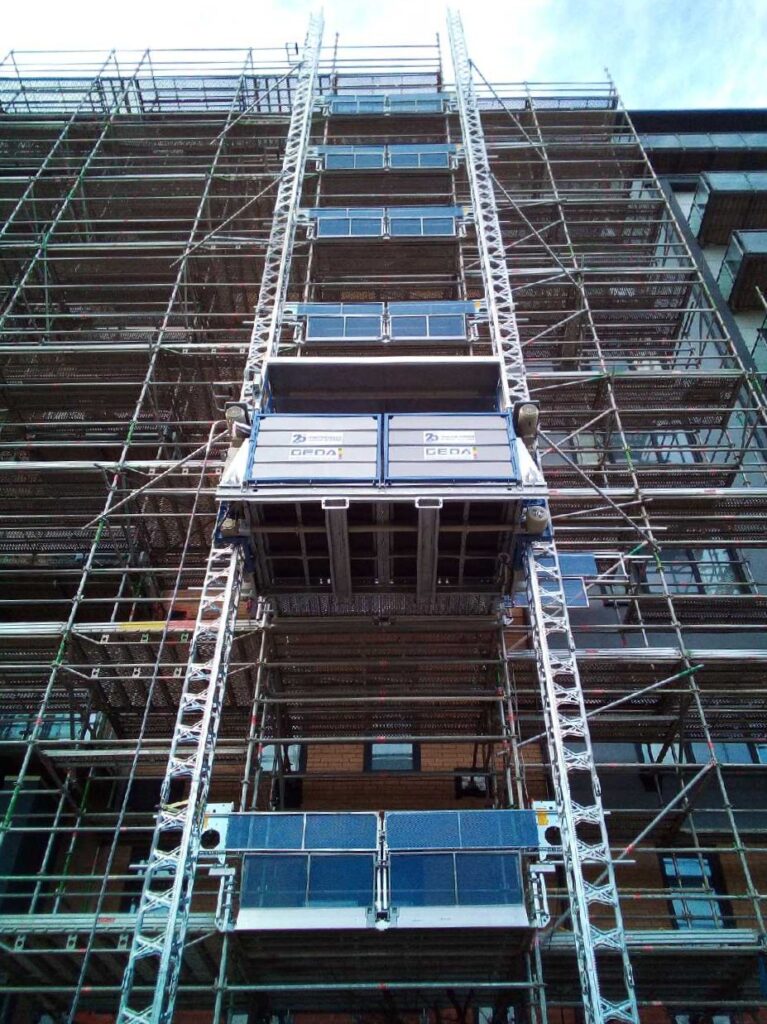 NTP offer a wide range of Passenger & Goods Hoists, Transport Platforms, Goods only Hoists and Scaffold Winches, with many being available as a singular or twin configuration. We can also provide a range of accessories with our hoists. These include Landing Protection Panels, Landing Infill plates, Landing Bridges, ‘Top Hats’, Roof Extensions, Scaffold Carriers, Cast-in sockets and Wireless Call Systems, etc.
